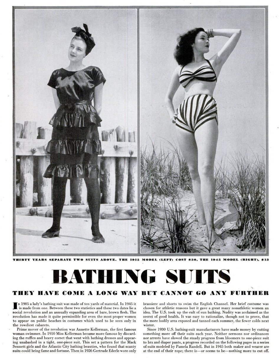 I was looking through an old 1945 edition of Life Magazine, published right around the time of the debut of the two-piece swimsuit. Here's what the mainstream media (no, not a Christian newsletter, but the most popular magazine at the time) had to say about the new swimwear: