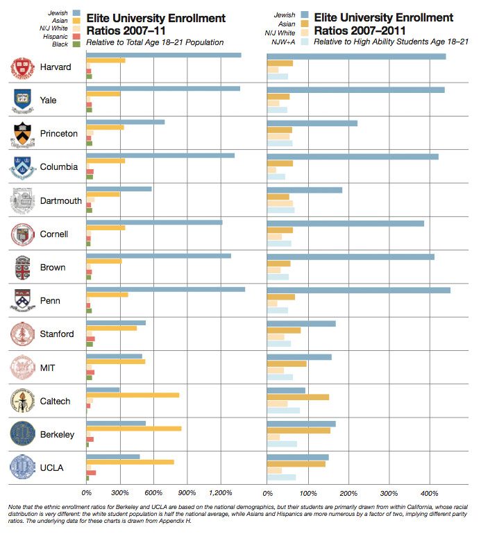 Due to these practices, White people are extremely underrepresented in Ivy League schools, a long known as a gateway to elite institutions. More Blacks and Hispanics are accepted in relation to the total population, despite being much less qualified on average.