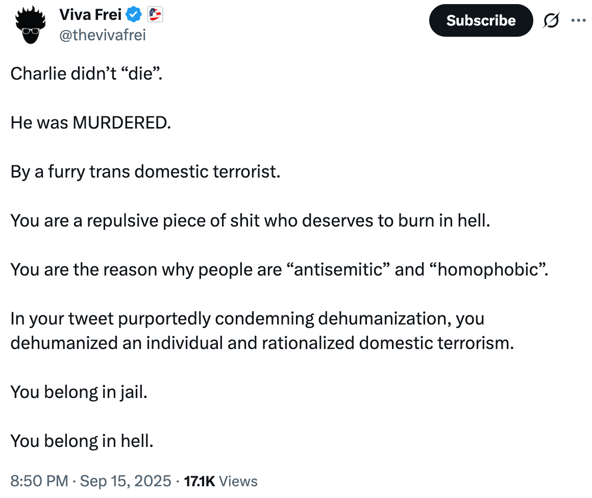 Also Charlie Kirk was a vile bigot who did immeasurable harm to so many people by normalizing dehumanization.
