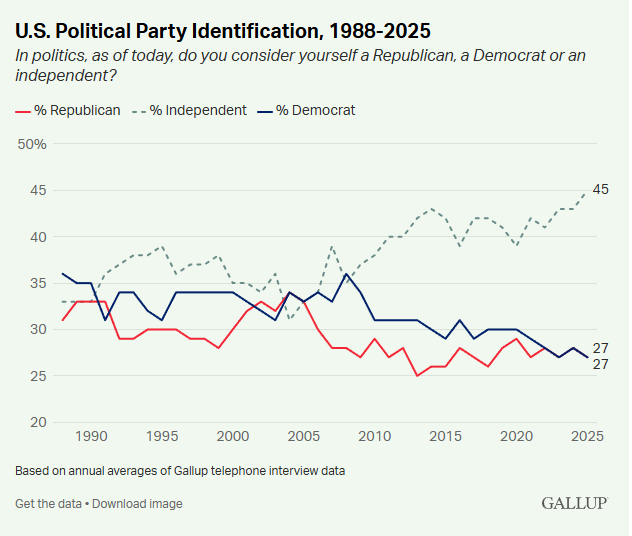 A record-high 45% of U.S. adults now identify as political independents in 2025, according to Gallup polling, marking a sharp rejection of the two major parties just one year into President Donald Trump's second term.