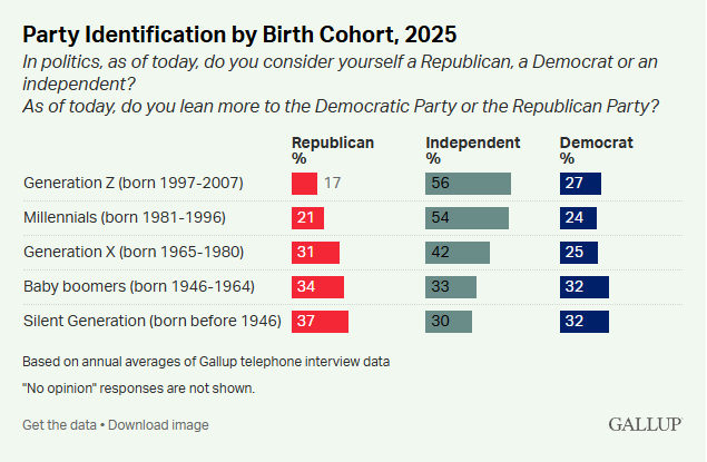 Majorities of Gen Z (56%) and millennials (54%) identify as independents, along with more than four in 10 Gen X adults.