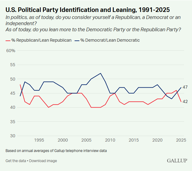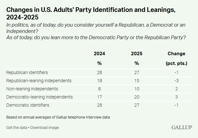 Americans are fleeing labels, yet the Democratic tilt among independents reflects backlash against the incumbent rather than genuine affection for Democrats, whose favorability ratings remain historically low.