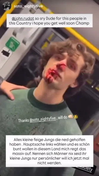 "Originally, I had went to Germany to visit my host father. I'd spent a year abroad here in Dresden in 2022-2023 and I fell in love with the city from the second I got here. Now that's also separate to the last 10 years as I've been told since the accident. I've had hundreds of people reach out to me and give me their claims and their stresses about over the last 10 years that immigration problem and the violence problem has been really rising and becoming a legitimate threat to everyday safety. People nowadays tell me that they are afraid to use the tram and understandably so, look at my face. I completely understand where they're coming from," Rudat said to Armstrong.