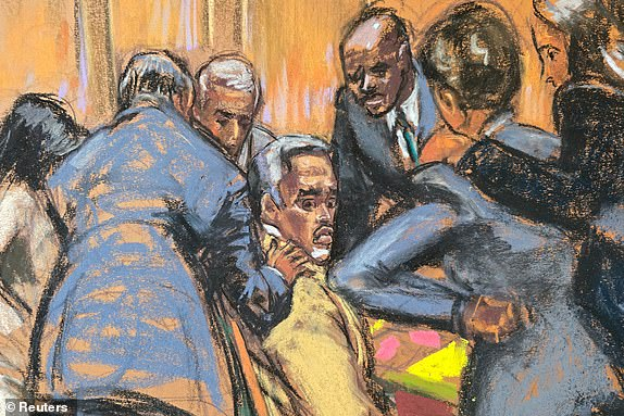 Court sketches captured a visibly shaken Combs, eyes wide, huddling with his legal team as the partial verdict was announced.