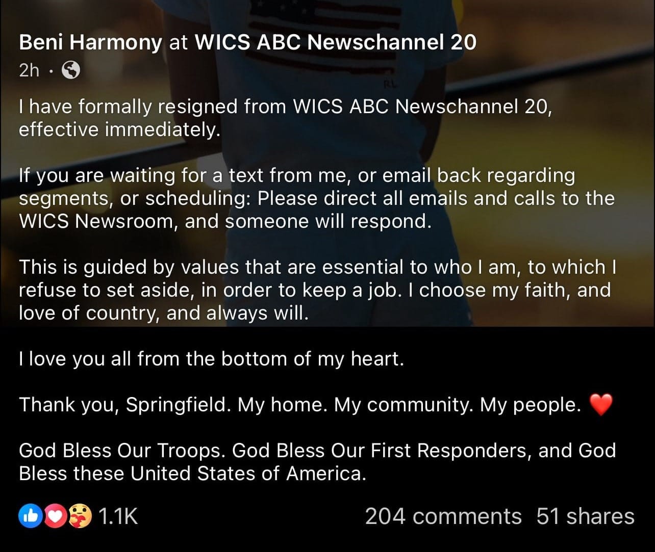 "Effective immediately, I have resigned from @WICS_ABC20 after being SUSPENDED for airing a non-partisan tribute to Charlie Kirk this past Friday." Said Harmony to her followers on X.