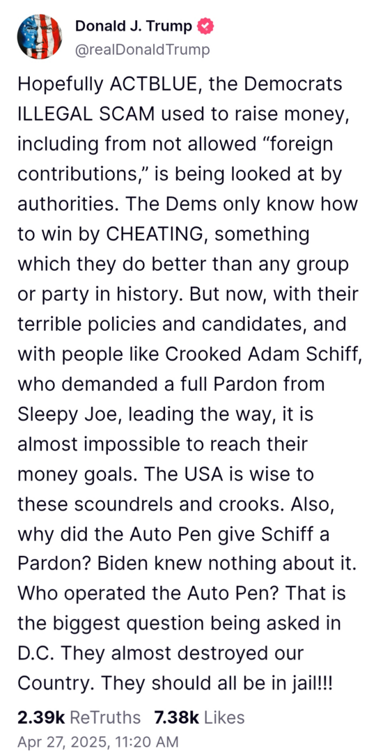 In a January 12, 2025, Truth Social post, Trump wrote, "Hopefully ACTBLUE, the Democrats ILLEGAL SCAM used to raise money, including from not allowed ‘foreign contributions,’ is being looked at by authorities. The Dems only know how to win by CHEATING, something which they do better than any group or party in history."