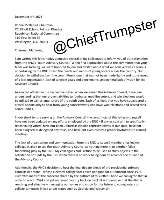 Even members of the council itself began to rebel. In December 2023, Republican strategist Caroline Wren and several other members publicly resigned, calling out what they described as “a lack of organization, tangible goals, and vision.” Their letter was blunt- the council, they said, was “another failed fundraising ploy by the RNC.”