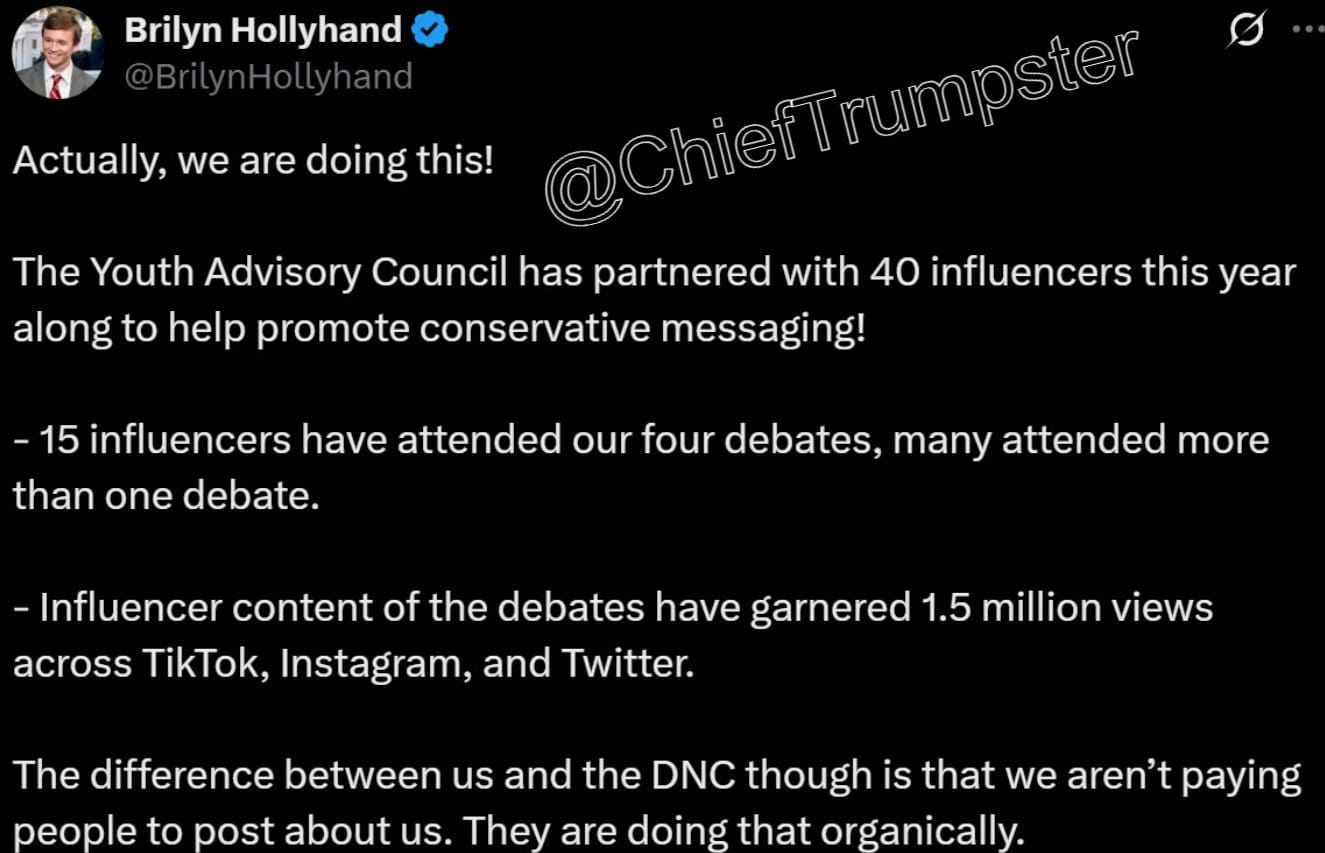 The objective of the RNC Youth Council seemed logical—give Gen Z conservatives a seat at the table, advise the RNC on youth engagement, and help mobilize young voters to support Donald Trump. In such a close election, mobilizing the youth would be a perfect way for the RNC and Brilyn to help Trump win the election.