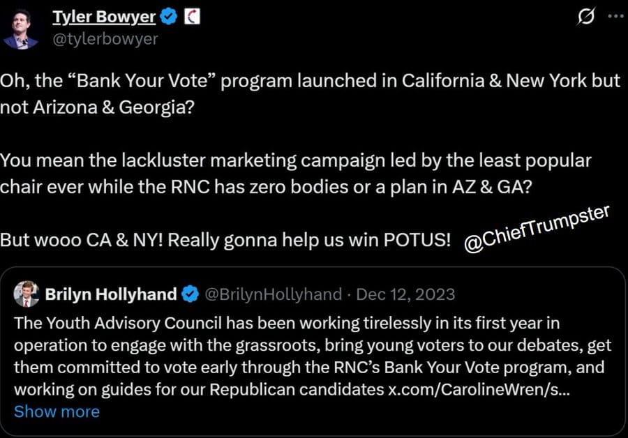 Even Turning Point Action COO Tyler Bowyer criticized him for defending the RNC’s “Bank Your Vote” program- which, unbelievably, launched in deep-blue California and New York instead of swing states like Arizona or Georgia.