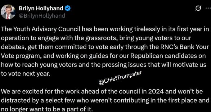 Brilyn, as Chair of the RNC Youth Advisory Council, oversaw the collapse of the Gen Z Group, and covered for the swamp.