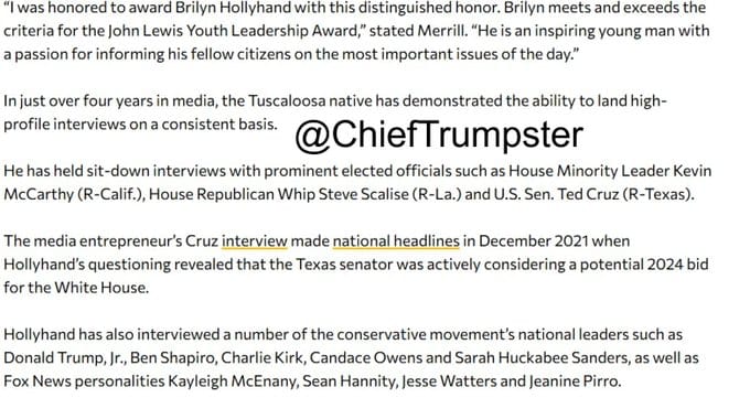 If Brilyn Hollyhand’s record with the RNC Youth Advisory Council wasn’t enough to cast doubt on his leadership, his receipt of the John Lewis Youth Leadership Award in 2022 raises even more serious ethical questions. The award was handed to him by John Merrill, Alabama’s Secretary of State at the time, who also served as Chair of the National Association of Secretaries of State (NASS)- the organization that issued the honor.