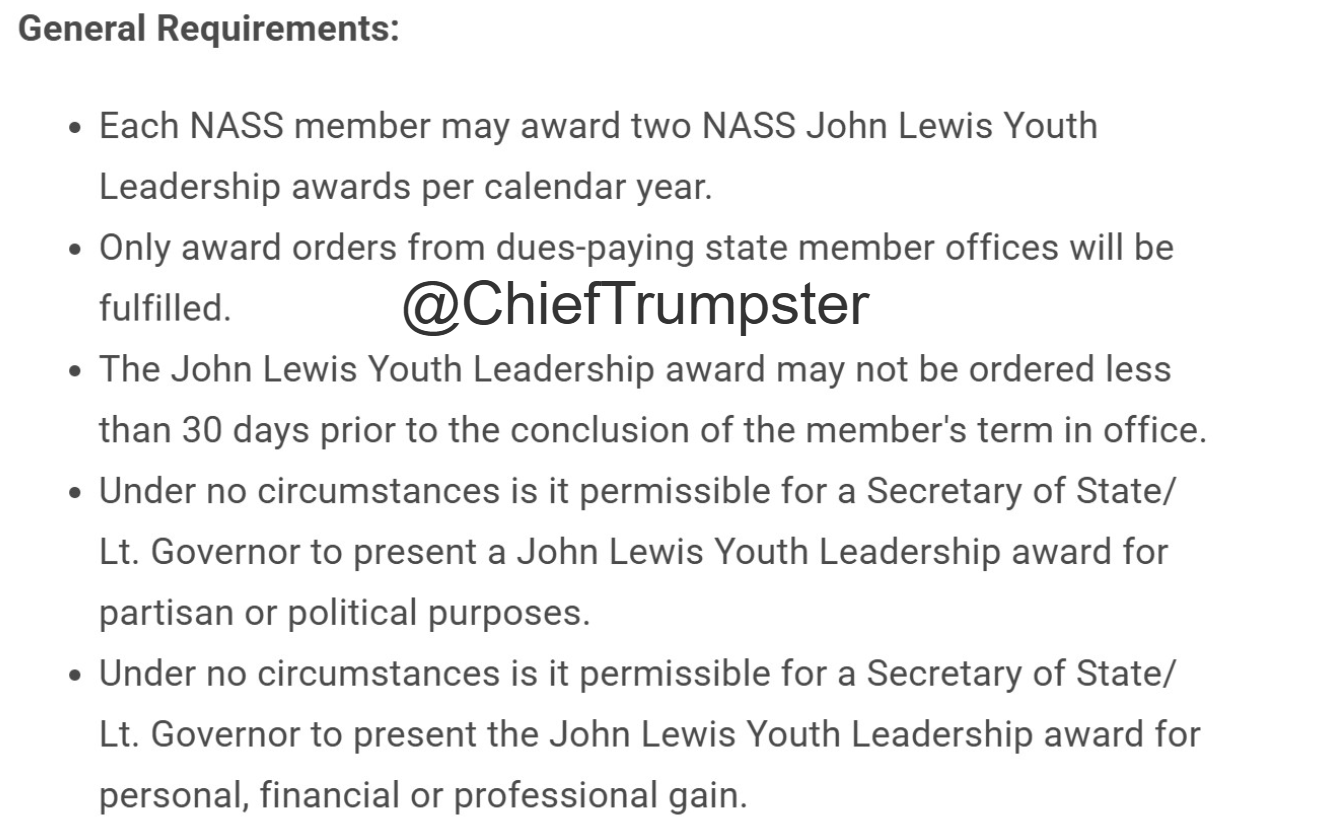And yet the John Lewis Youth Leadership Award’s own ethics rules explicitly state, “Under no circumstances is it permissible for a Secretary of State to present the John Lewis Youth Leadership award for personal, financial, or professional gain.”