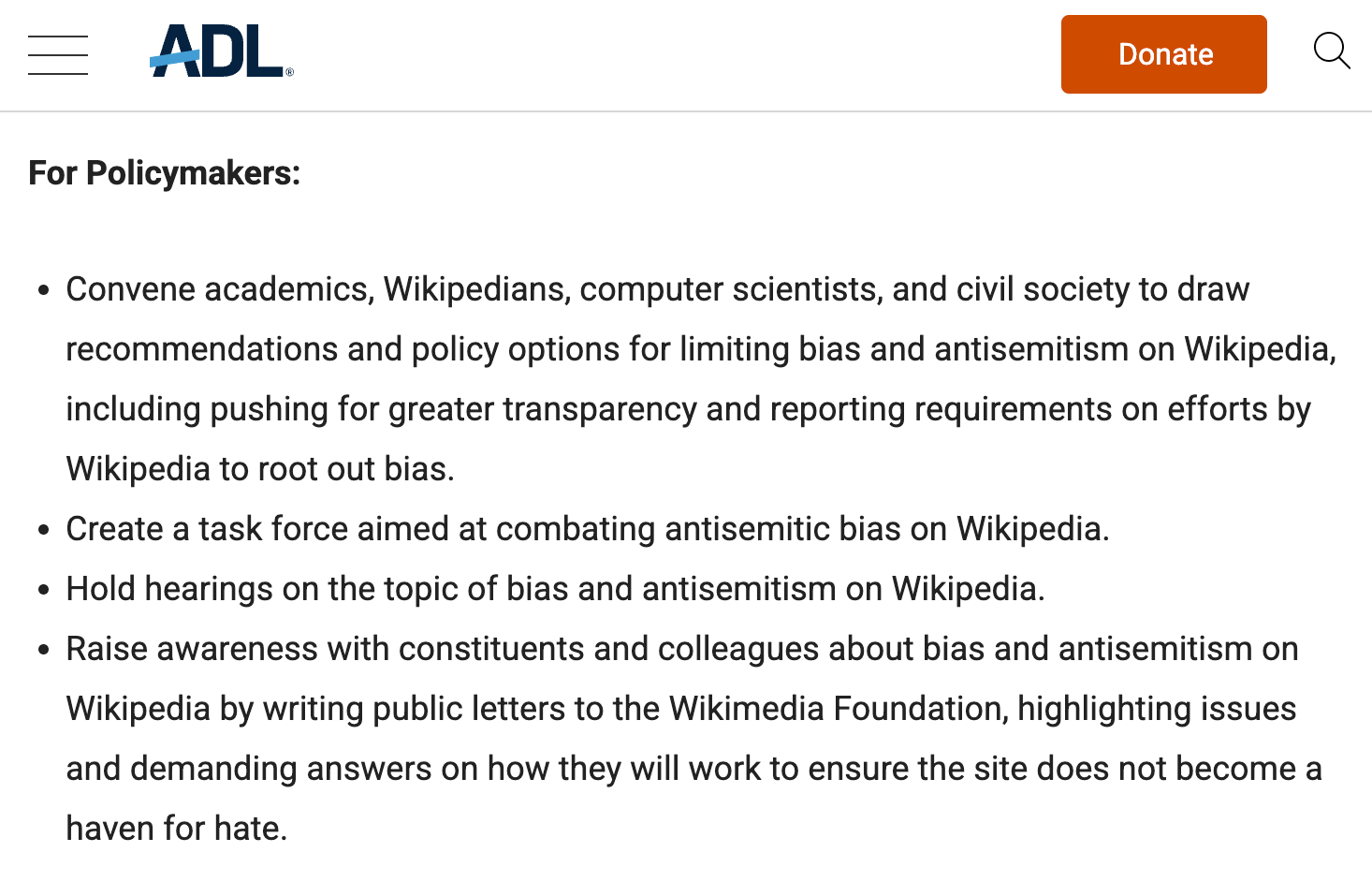 The ADL urged Congress to hold hearings, create a task force on antisemitic bias, and force Wikipedia to tighten editorial oversight.