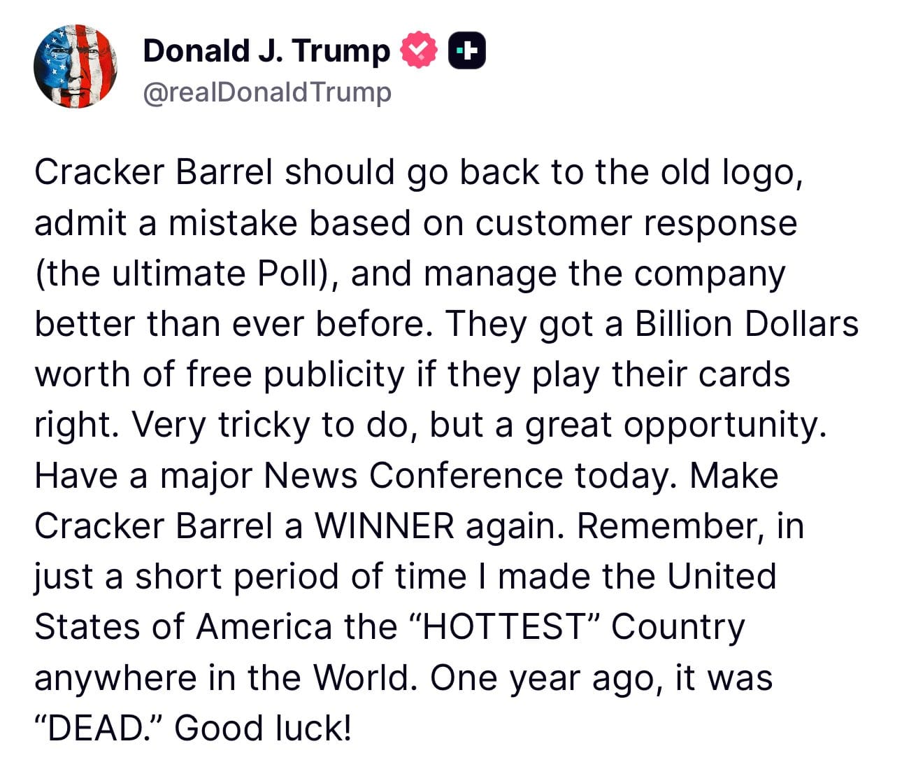 The story hit its peak yesterday when President Trump publicly urged Cracker Barrel to reverse its decision, calling it “a billion dollars’ worth of free publicity.”