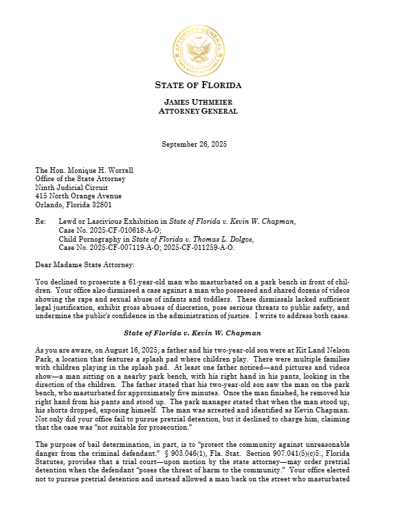 Florida Attorney General James Uthmeier launched a scathing attack on State Attorney Monique Worrell Friday, warning she is refusing to prosecute a man who masturbated in front of children at a park and another who shared videos of infant rape.