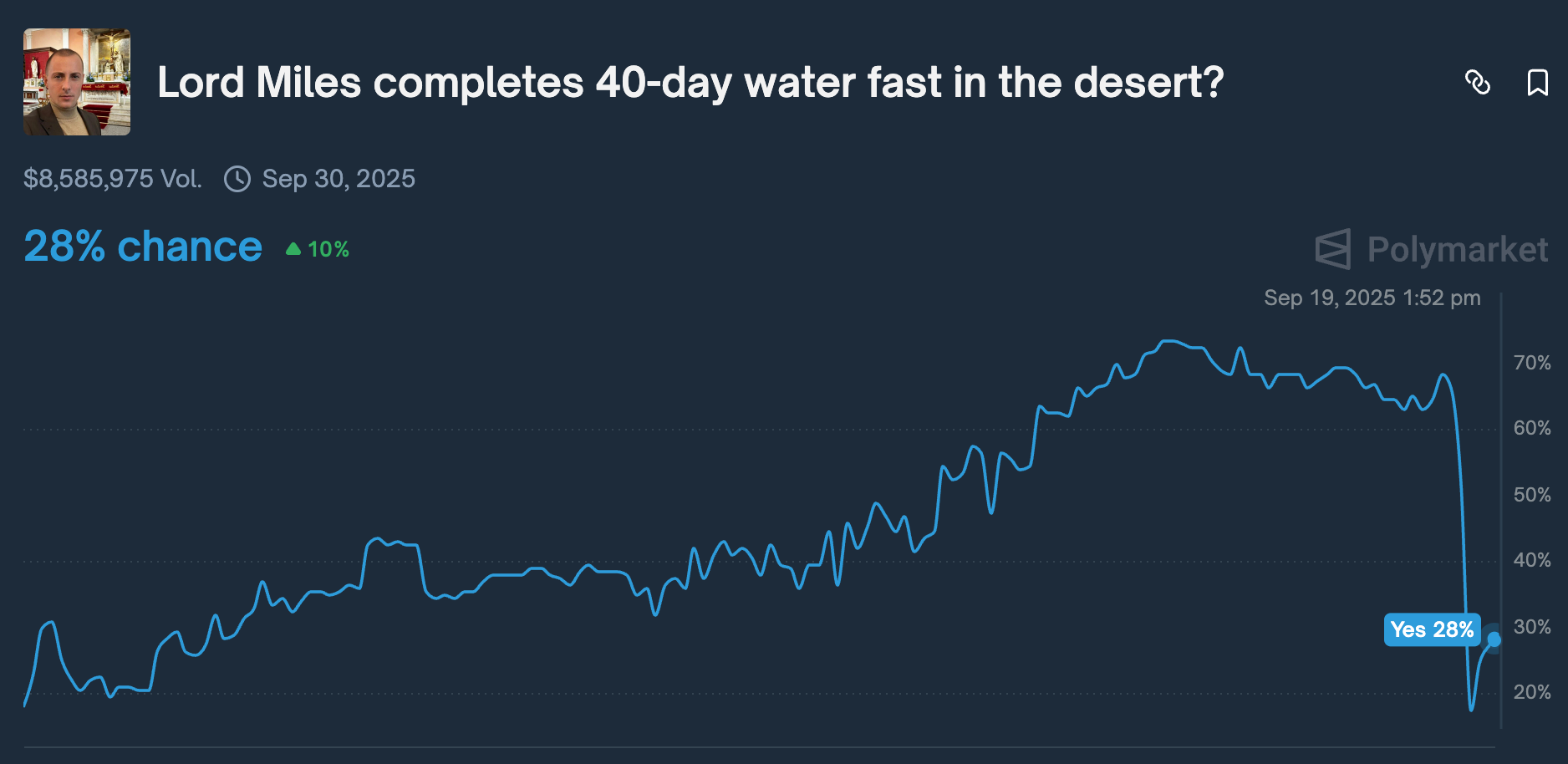 On Polymarket there was 69% chance of Miles completing his fasting challenge, that plummeted overnight down to 28%.