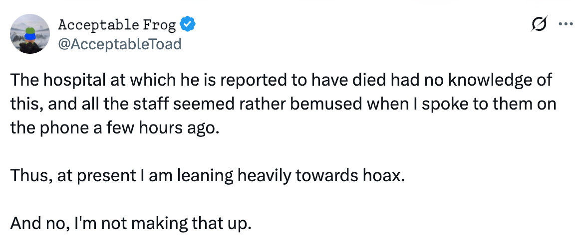 It's hard to take this announcement at face value for three reasons: 1) Lord Miles has faked his death before 2) there are wagers involved and manipulation can occur for financial reasons 3) Monarch is the only person to confirm his death we have yet to hear from friends and family.