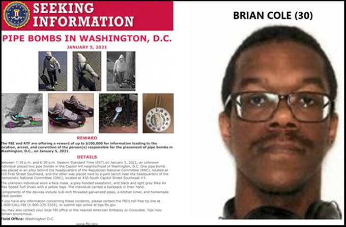The Trump administration's Justice Department announced the arrest of Brian Jerome Cole Jr., a 30-year-old Virginia man with no prior criminal record, charging him with planting viable pipe bombs outside the Republican and Democratic national committee headquarters on the eve of the January 6, 2021, Capitol riot.