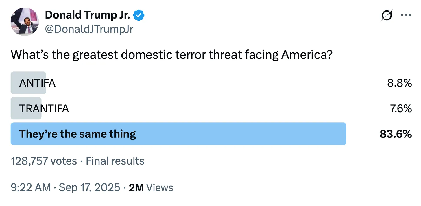 Donald Trump Jr. captured the sentiment: “What is the greatest domestic terror threat facing America: ANTIFA or TRANTIFA?”