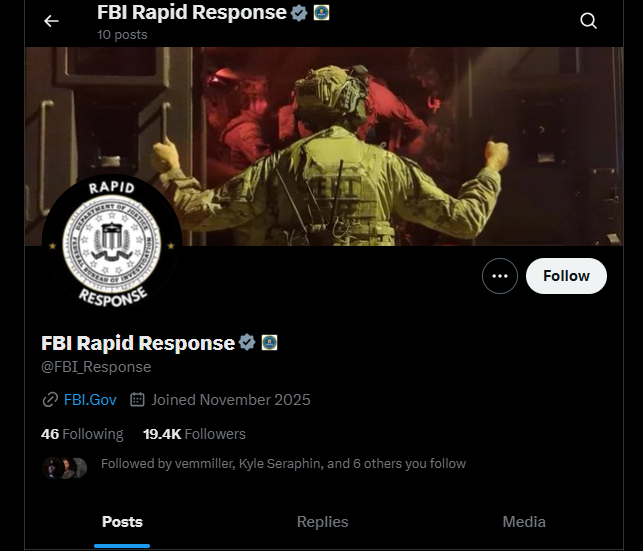 🚨#BREAKING: The FBI has launched a new X/Twitter account called FBI Rapid Response, created specifically to address and respond to @KyleSeraphin’s posts in real time.