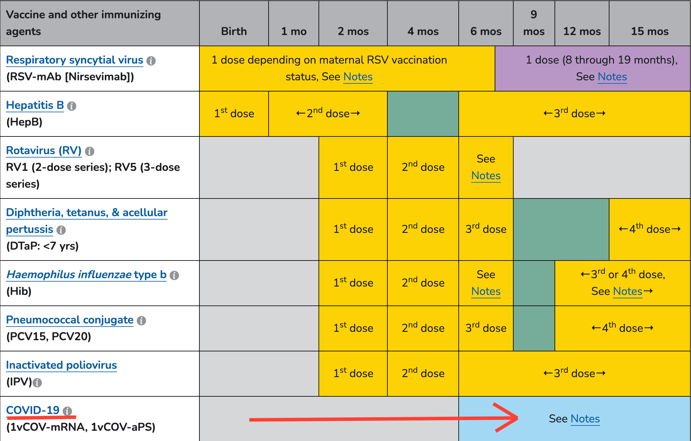 However, over the past couple of months, the updated vaccine chart has gone from recommending three doses to now directing users to "see notes” regarding COVID-specific recommendations. We are essentially one step away from the vaccine's complete removal from the childhood schedule.