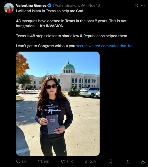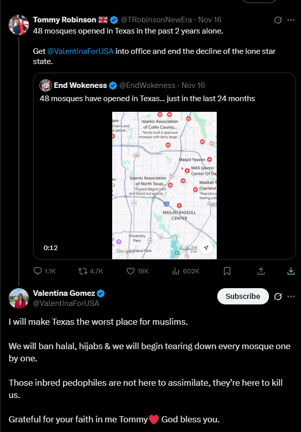 Gomez posted the threat in reply to British far-right activist Tommy Robinson, who had shared a report claiming 48 new mosques had opened in Texas.