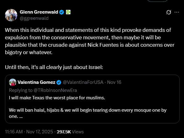 Known for her rage-bait provocations that set social media ablaze, Republican congressional candidate Valentina Gomez ignited a firestorm Monday with a barrage of personal attacks against journalist Glenn Greenwald, escalating a spat over bigotry, Israel and Islam that exposed raw fissures in conservative circles.