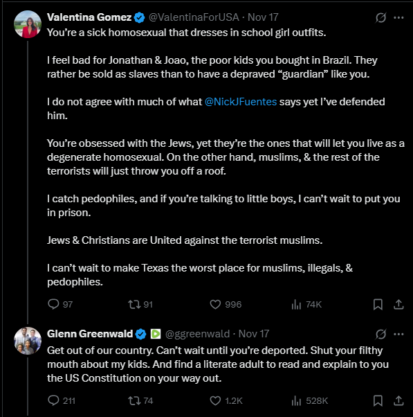 Greenwald retorted: "Get out of our country. Can’t wait until you’re deported. Shut your filthy mouth about my kids. And find a literate adult to read and explain to you the US Constitution on your way out."