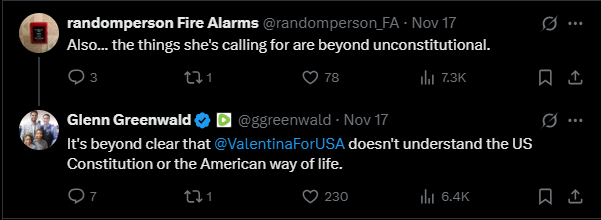 He added in a separate post: "It's beyond clear that @ValentinaForUSA doesn't understand the US Constitution or the American way of life."