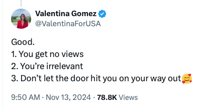 Not everyone seemed to care about Don's exit from X, as many users were quick to point out Don Lemon isn't even relevant enough for anyone outside of X to actually care. Popular conservative commentator, Valentina Gomez, lit him up in the comments saying: