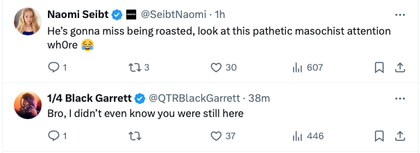 "He's gonna miss being roasted, look at this pathetic masochist attention whore."