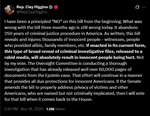 "The Oversight Committee is conducting a thorough investigation that has already released well over 60,000 pages of documents from the Epstein case," he continued. "That effort will continue in a manner that provides all due protections for innocent Americans. If the Senate amends the bill to properly address privacy of victims and other Americans, who are named but not criminally implicated, then I will vote for that bill when it comes back to the House."