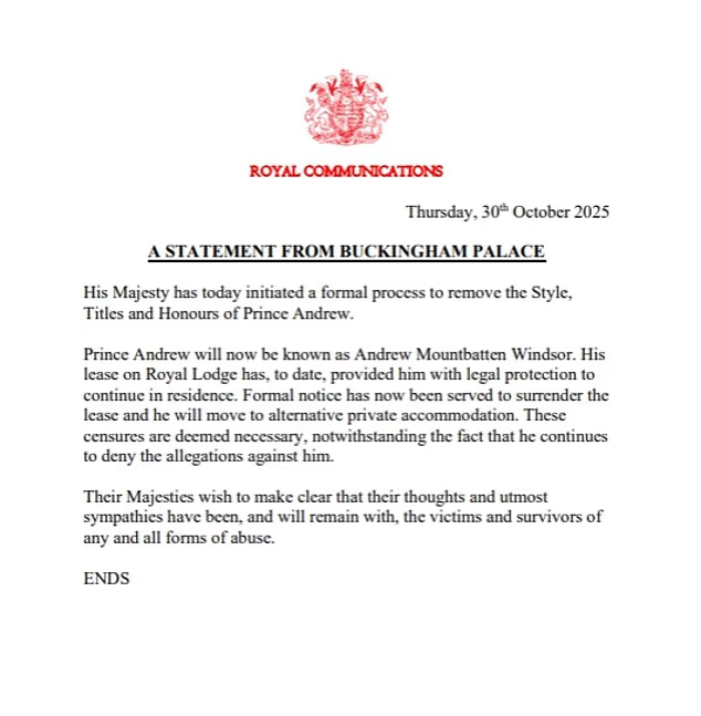 Buckingham Palace announced the 65-year-old former Duke of York immediately loses his prince designation and must vacate the Windsor Castle estate residence he shared with ex-wife Sarah Ferguson for over two decades at peppercorn rent.