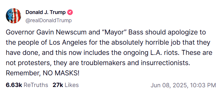 “Governor Gavin Newscum and ‘Mayor’ Bass should apologize to the people of Los Angeles for the absolutely horrible job that they have done,” he wrote on Truth Social, calling protesters “troublemakers and insurrectionists.”