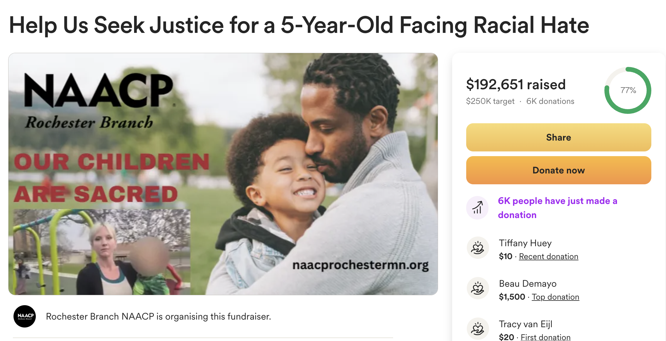 The organization launched a GoFundMe campaign, “Help Us Seek Justice for a 5-Year-Old Facing Racial Hate,” aiming for $250,000 to fund legal support for the child’s family and anti-racism initiatives.