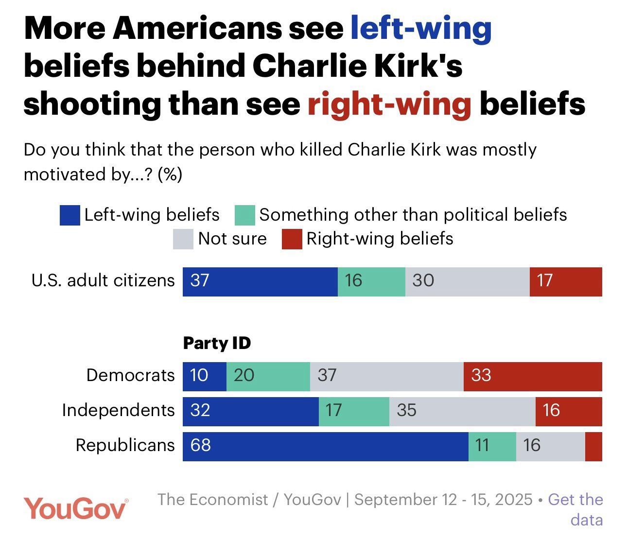 "The shooting death of right-wing activist Charlie Kirk this week has sparked a national debate about political violence — and YouGov has been polling regularly to find out what Americans are thinking," the firm reports. "News is still coming in about alleged shooter Tyler Robinson, but here are some of the takeaways from YouGov's polling so far."
