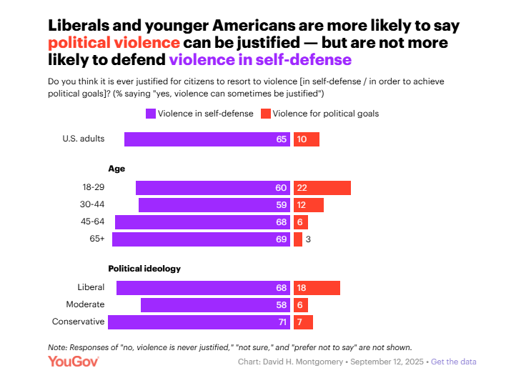 "Among the very liberal, 25 percent say political violence can sometimes be justified and 55 percent say it can't; among adults under 30, 19 percent say it can be justified and 51 percent say it can't."