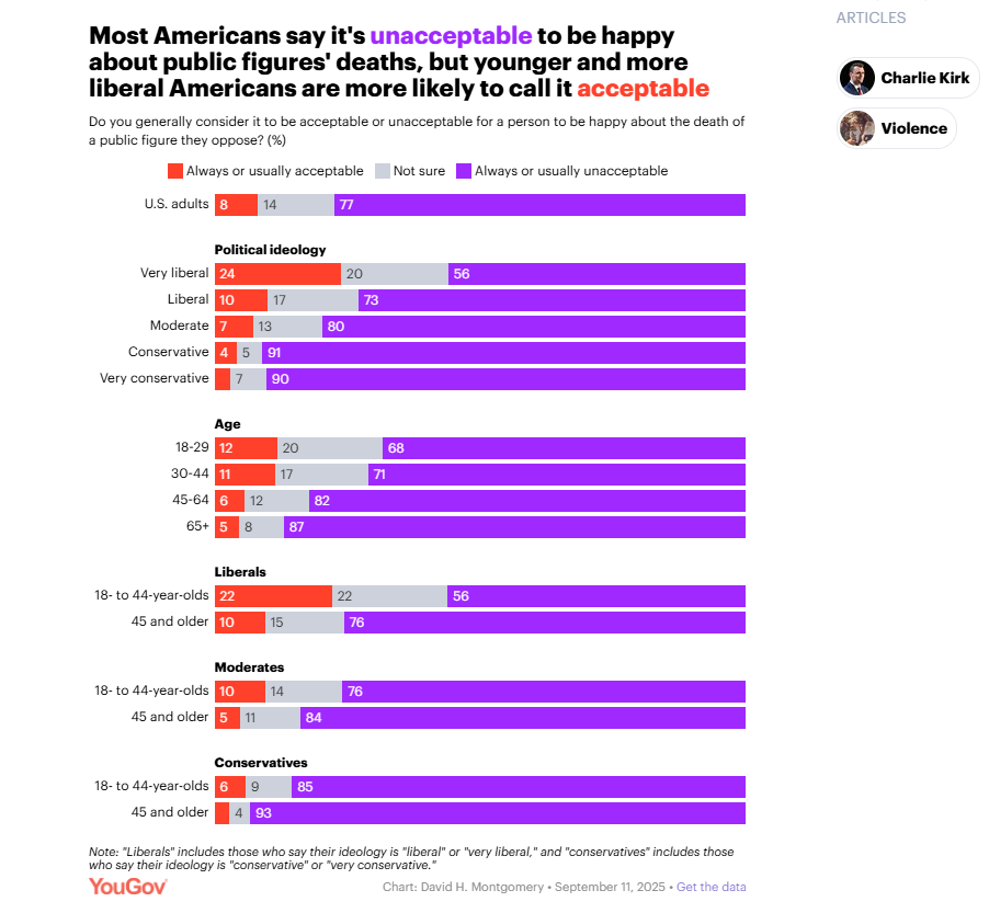 "It is true that liberal Americans are more likely than conservatives to defend feeling joy about the deaths of political opponents," YouGov concedes. "16% of liberals say this is usually or always acceptable... That compares to 4% of conservatives and 7% of moderates."