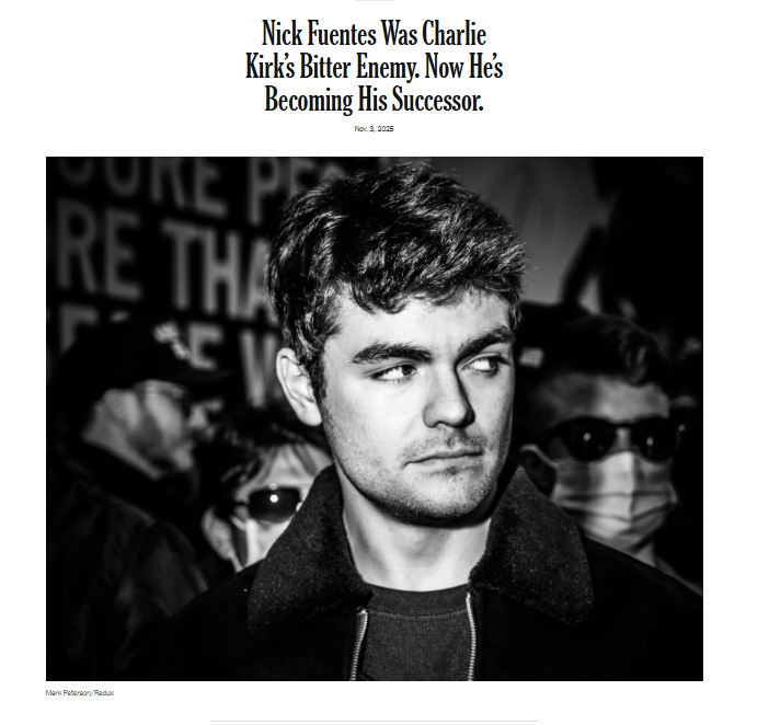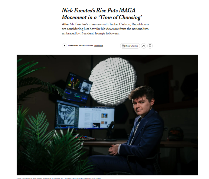 Then on November 6, 2025, NYT warned, "Nick Fuentes's Rise puts MAGA Movement in a 'Time of Choosing.'"