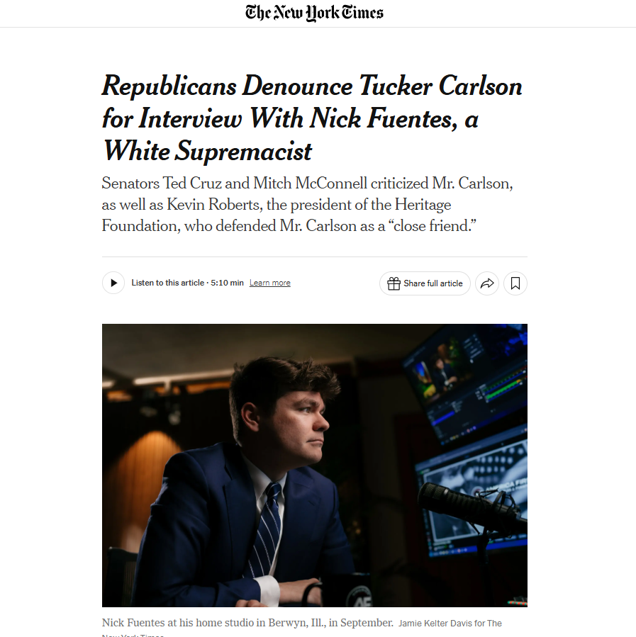 The NYT then highlighted the sweeping effort by the Jews to censor Fuentes following his interview with Carlson, warning Fuentes, who is Mexican and Italian, is a white supremacist.