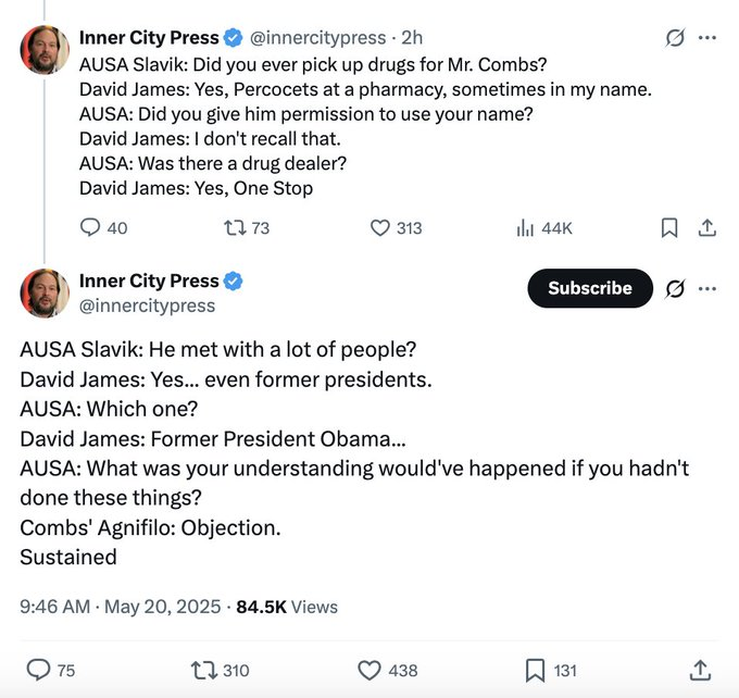 James confirmed he regularly assisted Combs with obtaining drugs, stating, “Yes, Percocets at a pharmacy, sometimes in my name."