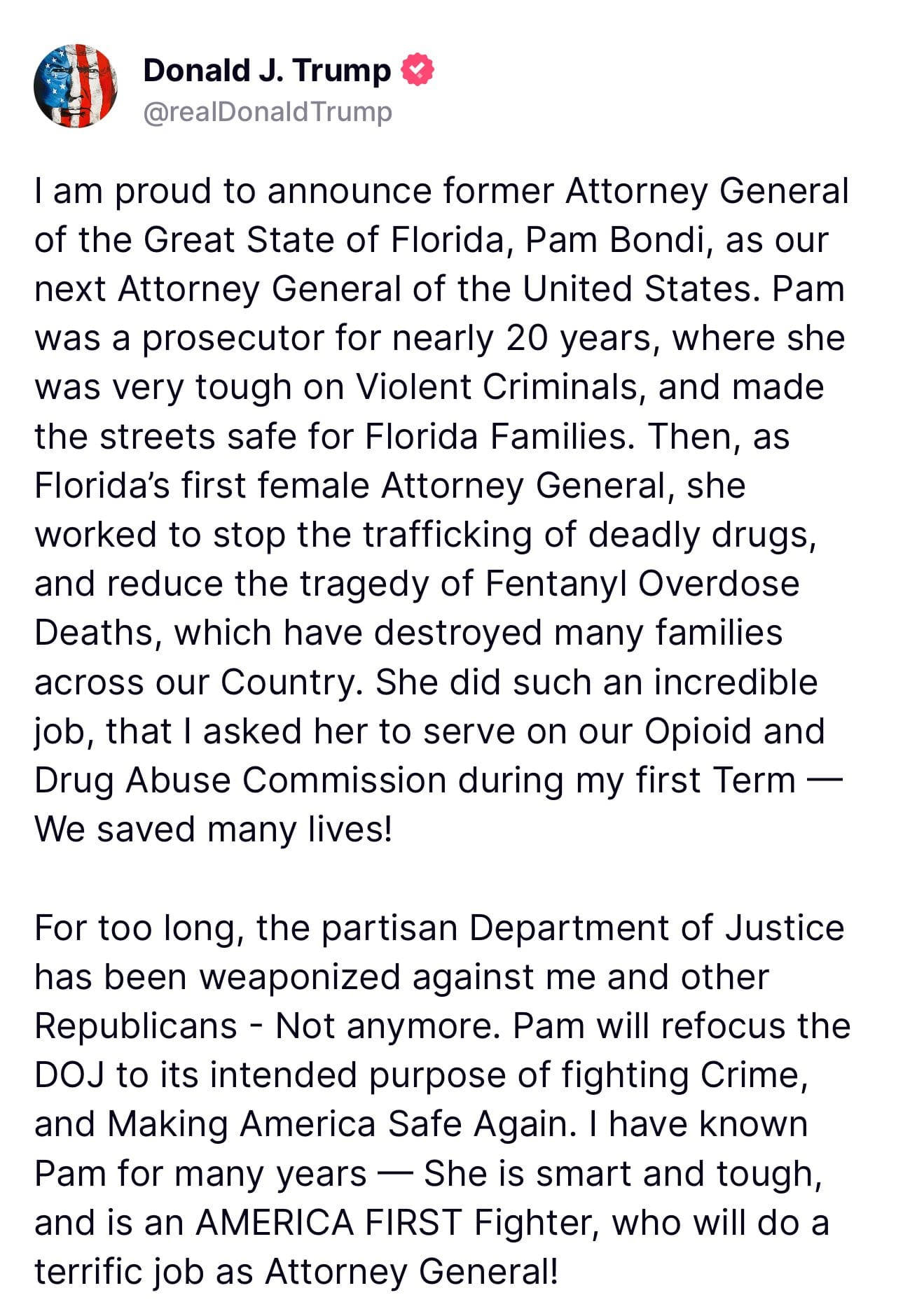 Donald Trump has picked former Attorney General of Florida, Pam Bondi as Attorney General of the Department of Justice, Trump confirmed on Truth Social.