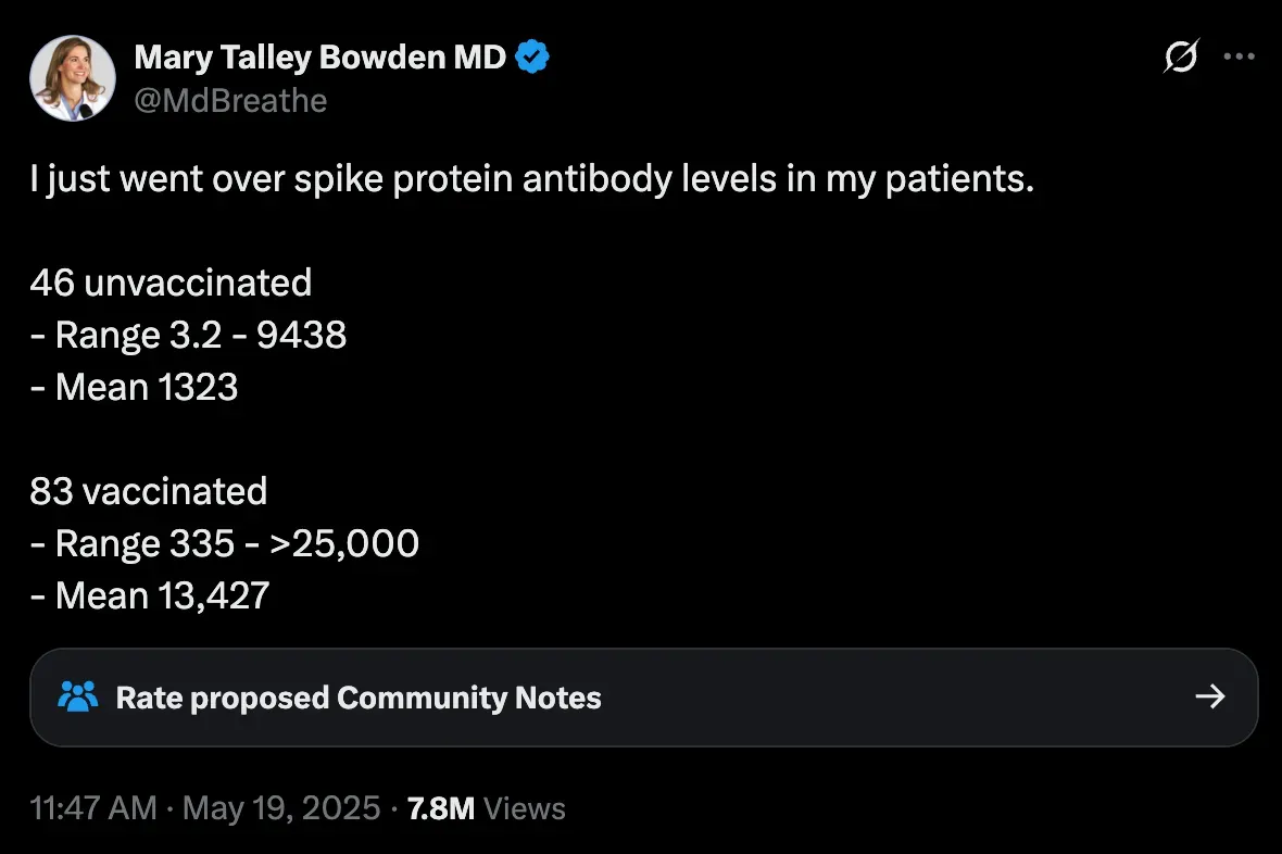 Bowden’s claims didn’t stop there. She revealed stark differences in spike protein antibody levels between her patients.