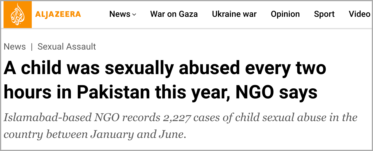 So let's stop talking about Islam for a second and instead talk about Pakistan. According to an NGO in Islamabad, 12 children are sexually abused per day – or one every two hours – in Pakistan in 2023.