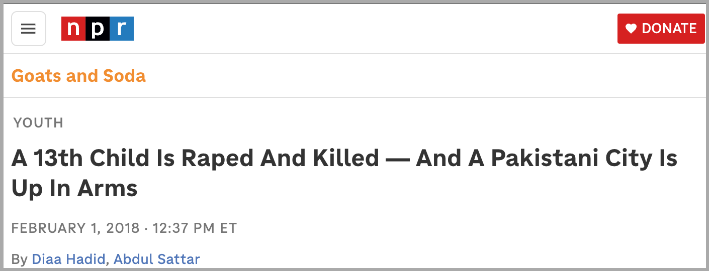 According to a study by the Sustainable Social Development Organization, a woman is raped every 45 minutes in Pakistan. Sexual violence and abuse is an epidemic from this specific culture and group of people.