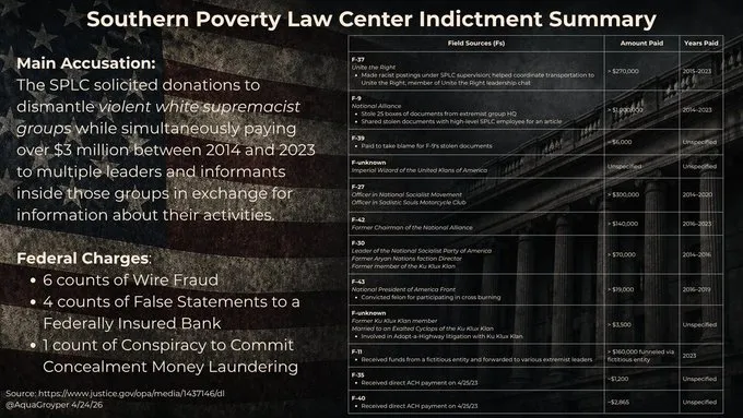On Tuesday, the Southern Poverty Law Center (SPLC) was indicted for using paid informants to monitor and track “extremist” organizations. Acting AG Todd Blanche stated that they had paid at least eight different people, including those affiliated with violent, ancient organizations like the Ku Klux Klan, over $3M between 2014 and 2023.