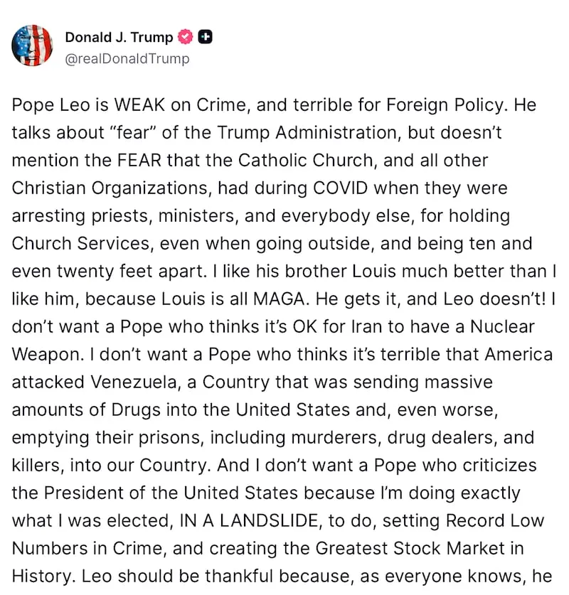 He also claimed that the Pope was completely fine with Iran possessing nuclear weapons. This claim is wildly untrue, as Leo has repeatedly called for global nuclear disarmament, ending the arms race, and achieving peace through dialogue.