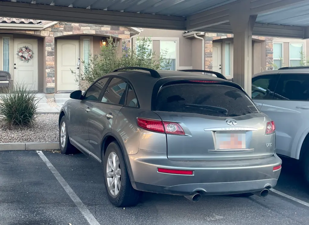 Twiggs’ beaten-up vehicle, an Infinity compact, remains parked outside, work gear and a sandwich wrapper strewn inside.