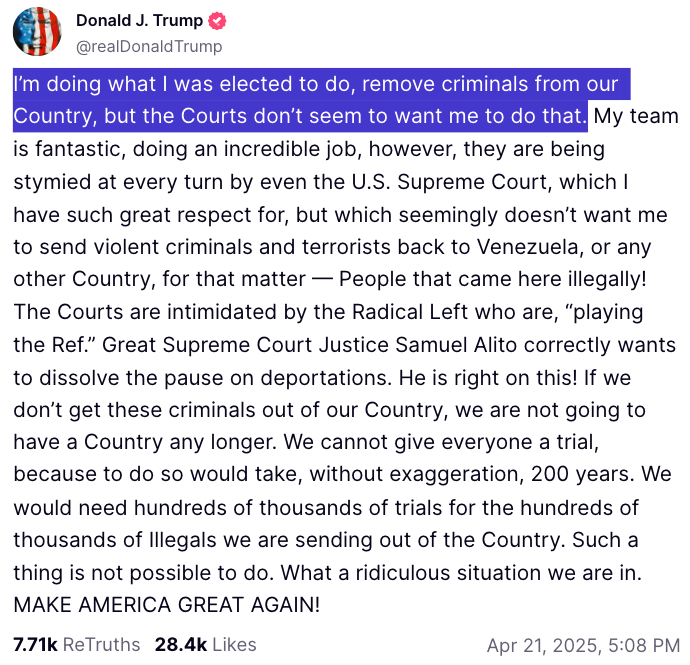 On Truth Social last month, Trump stated, "I'm doing what I was elected to do, remove criminals from our Country, but the Courts don't seem to want me to do that," adding, "We cannot give everyone a trial, because to do so would take, without exaggeration, 200 years."