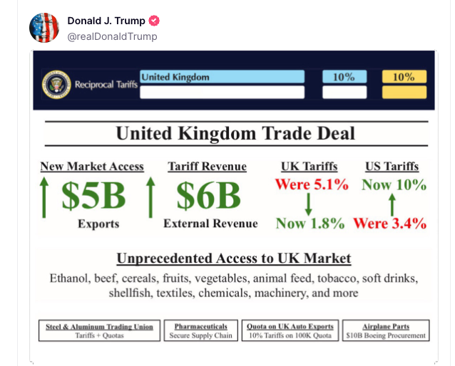 President Donald Trump announced a trade deal with the UK on Thursday. His plan was clearly—if succinctly—outlined in a Truth Social post. The winners: the American people... and needy Keir Starmer, the British PM whose approval ratings swing like a seesaw.